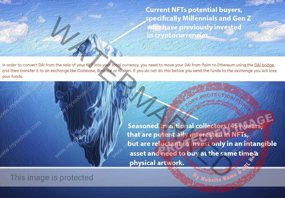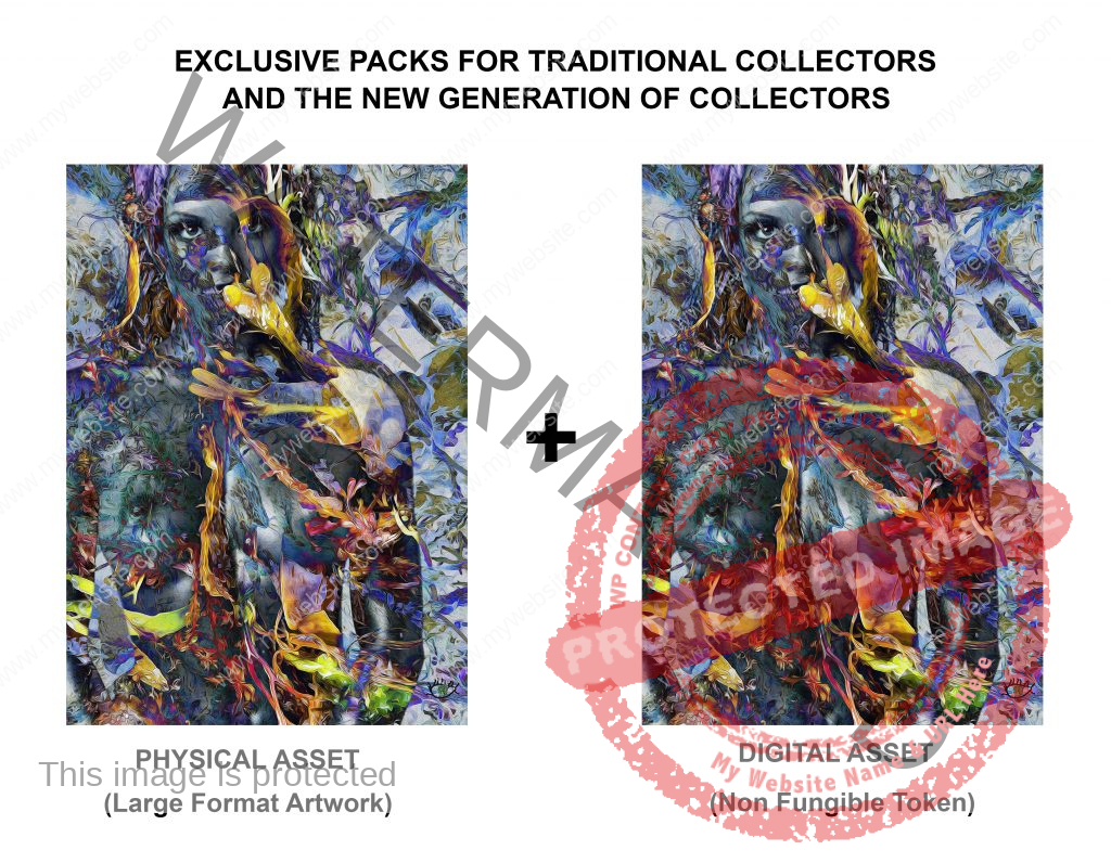 This will allow art collectors who are reluctant to invest in intangible assets to own a tangible painting (a 100x 150 cm unique creation printed on a 3.0 mm Dibond aluminum, for instance) PLUS an intangible digital asset inserted in the blockchain (a Non Fungible Token) for the same price.