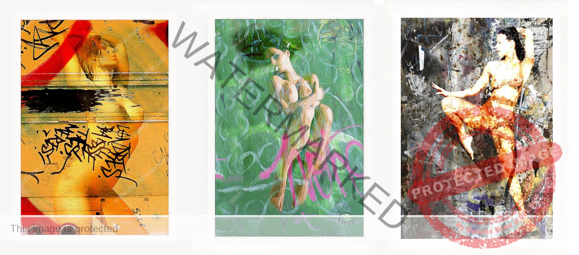 Using as background layer photographs of walls and doors chipped, and superimposing a layer of nude photos, I start to create totally new images. I use the lines of the nudes/black and white portraits, as well as the strength of the colors/textures of the abandoned sites, sculpted by time and weathering. I play with chance, the insignificant, trying to make sense, through my artistic look.